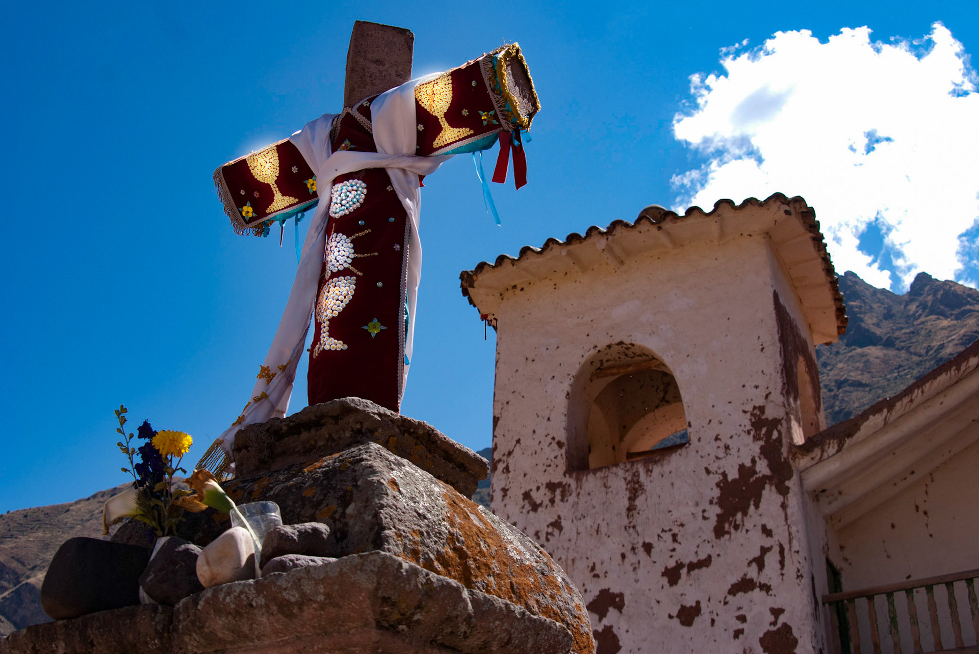Stone wall and courtyard with Church of San Miguel VIejo, Mexico